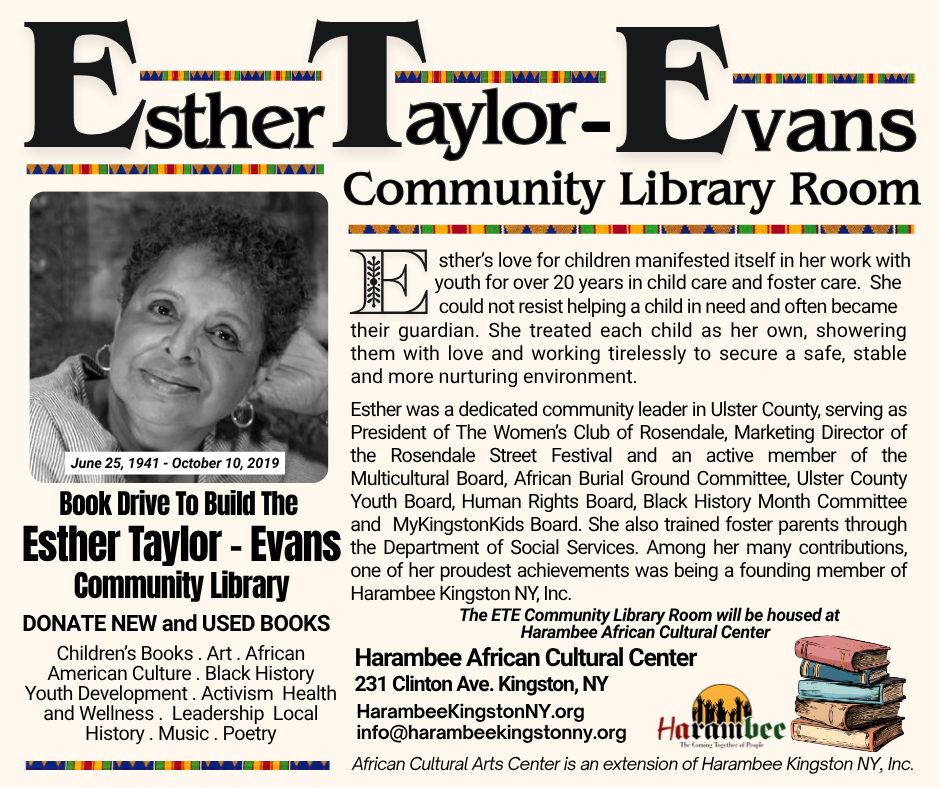 We are initiating a book drive for the newly dedication community library honor the life and legacy of Esther Taylor-Evans. The Esther Taylor-Evans Community Library / Reading Room will be housed at Harambee African Cultural Center at 231 Clinton Ave. in Kingston, NY.