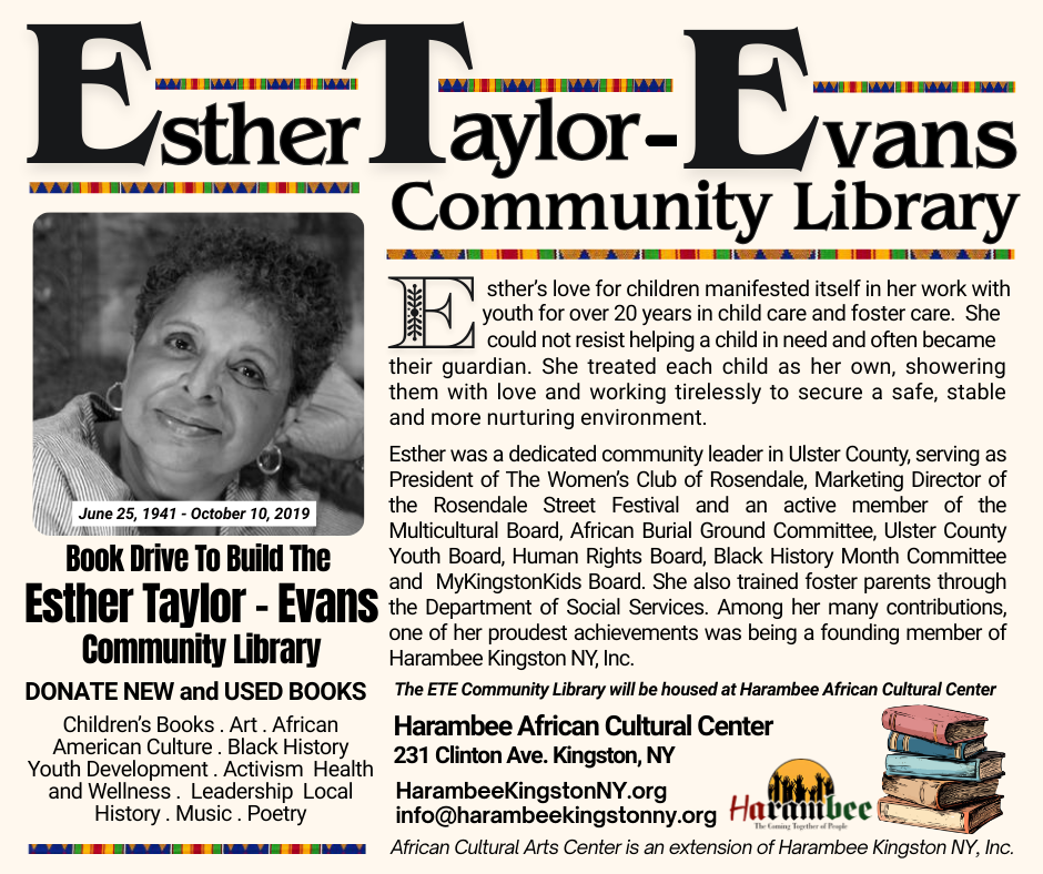 We are initiating a book drive for the newly dedication community library honor the life and legacy of Esther Taylor-Evans. The Esther Taylor-Evans Community Library / Reading Room will be housed at Harambee African Cultural Center at 231 Clinton Ave. in Kingston, NY.